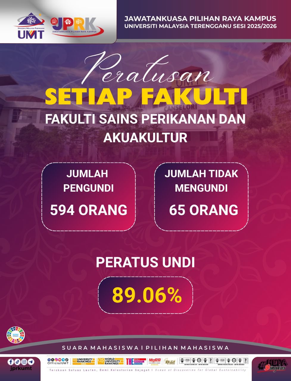 Congratulations and thanks to all FSPA members for successfully achieving the highest voter turnout in the UMT Campus Elections Session 2025/2026. All the cooperation given by the students of Bachelor of Science in Aquaculture with Honours, Diploma in Fisheries, Bachelor of Applied Science (Fisheries) with Honours, as well as all FSPA members is greatly appreciated.