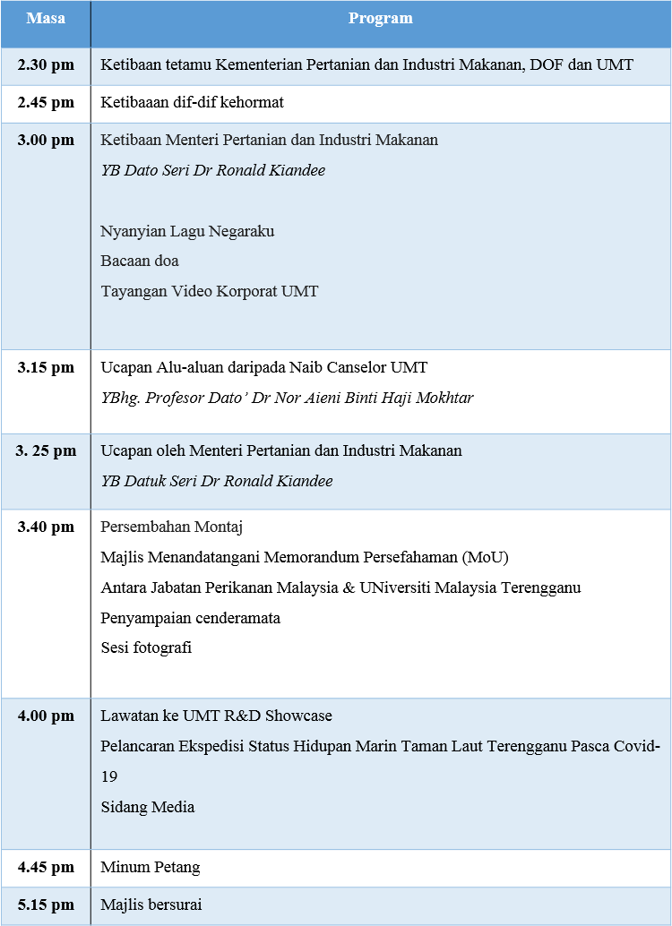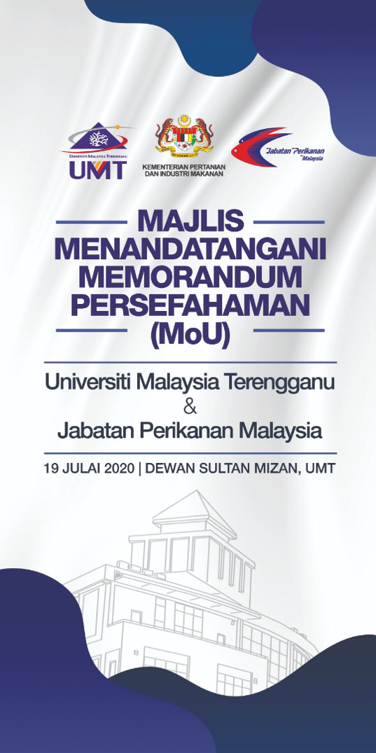 Universiti Malaysia Terengganu (UMT) akan menganjurkan Majlis Menandatangani Memorandum Persefahaman (MoU) Antara Jabatan Perikanan Malaysia dan UMT yang akan turut disaksikan oleh YB Dato Seri Dr Ronald Kiandee, Menteri Pertanian dan Industri Makanan sepertimana ketetapan berikut :