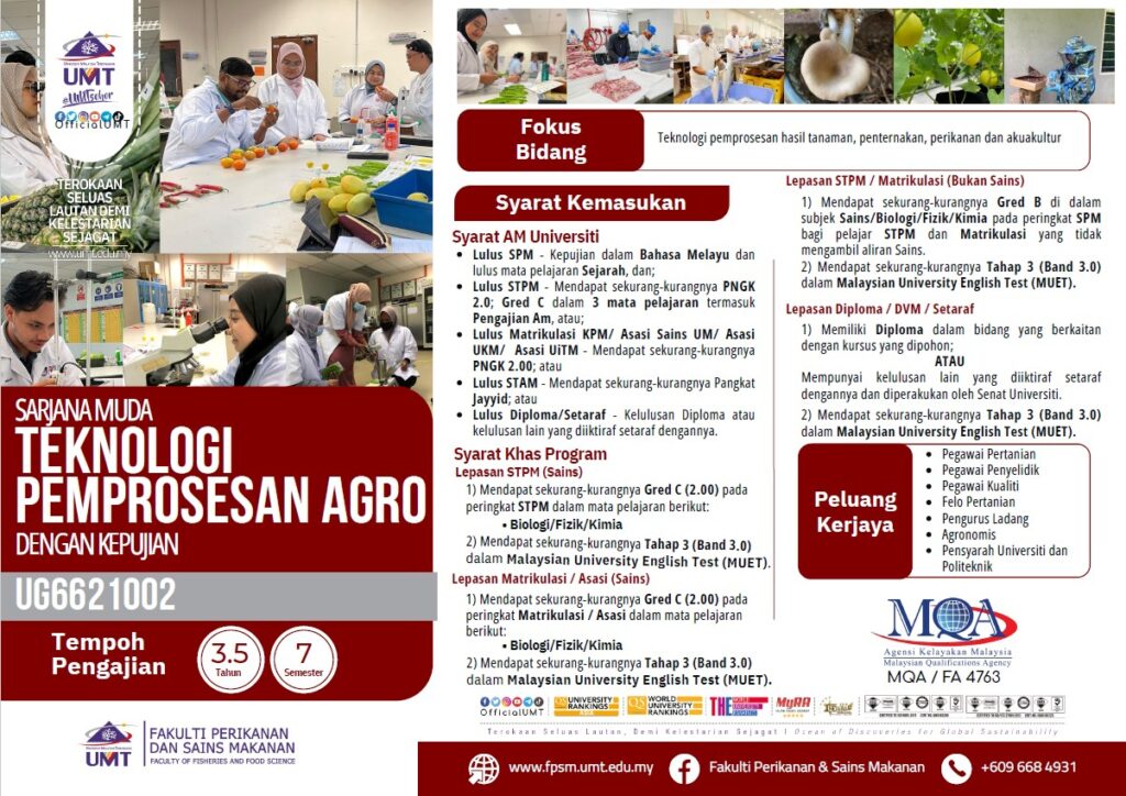 1. Program ini ditawarkan oleh Fakulti Sains Makanan dan Agroteknologi (Fakulti Baharu), Universiti Malaysia Terengganu, bermula sesi 2025/2026. Ia merupakan salah satu program pilihan pelajar yang lazim.
